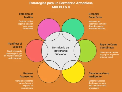 Estilo coherente: Definir un estilo —clásico, moderno o minimalista— y mantenerlo en todos los muebles dormitorio matrimonio asegura unidad y elegancia. Cuando todo sigue un hilo conductor, la habitación se siente más acogedora y relajante.